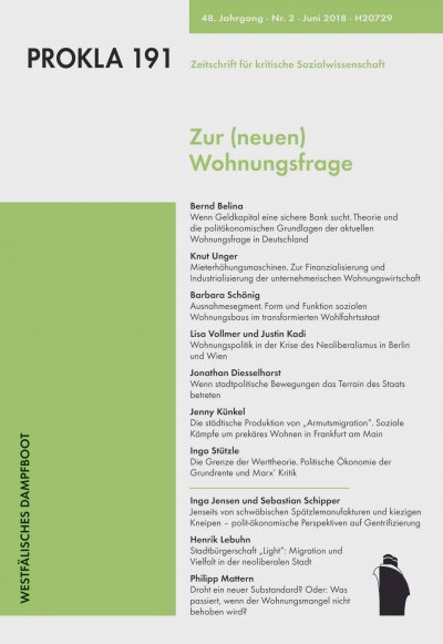 Bezahlbaren Wohnraum zu finden ist für viele Menschen in den Städten hierzulande zu einem schier unlösbaren Problem geworden. Trotz der 2013 verkündeten Mietpreisbremse stiegen die Immobilienpreise und Mieten weiter. Dieser erfolglose Versuch einer punktuellen und halbherzigen Reform zeigt, dass diese grundlegende Probleme berührt, die nicht durch eine partielle Preisregulierung zu lösen sind. Vor diesem Hintergrund diskutiert PROKLA 191 anhand empirischer Beiträge sowie theoretischer Reflexion die politökonomischen Gründe für die Wiederkehr der Wohnungsfrage im Kontext von Finanzialisierung, Neoliberalisierung und einer globalen Überakkumulation von Kapital.