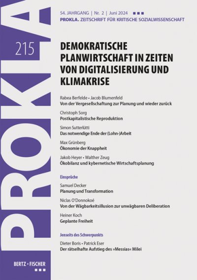 Seit einigen Jahren erlebt die Debatte über demokratische (Wirtschafts-)Planung einen neuen Aufschwung. Sie drehte sich zunächst primär um neue technische Entwicklungen, die demokratische (Wirtschafts-)Planung möglich machen sollen. Mit der Eskalation der Klimakrise hat sich der Schwerpunkt der Diskussionen mittlerweile zu ökologischen und politischen Fragen verschoben. Jenseits der technologischen und ökologischen Ebene stellt die Planungsdebatte aber vor allem politische und demokratische Fragen: Die produktive und reproduktive Struktur unserer Wirtschaft und Gesellschaft hängt aktuell zentral an den privaten Investitionsentscheidungen einiger Unternehmen, die wiederum gezwungen sind, profitabel zu wirtschaften. Ökologische, politische und soziale Aspekte sind für ihre Kosten-Nutzen-Rechnung zwangsläufig nachrangig. Die PROKLA 215 widmet sich daher der Frage nach demokratischer Planung von Produktion und Reproduktion im 21. Jahrhundert: Wie finden wir demokratische Mechanismen, um über die Richtung gesellschaftlicher Entwicklung bewusst zu entscheiden, anstatt zentrale Themen den blinden und anonymen Kräften des Marktes zu überlassen?